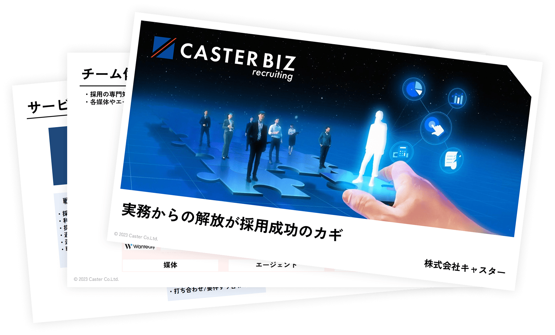 貴社の人事部としてCASTER BIZ recruiting が尽力いたしますのでご安心ください。今後、人事部の発足や採用担当者の採用を計画されている場合でも、採用のフローや成功ノウハウを言語化・仕組み化し、社内にナレッジとして残すことを重視。内製化ニーズに合わせて、業務レクチャーから引き継ぎまで実施。依存ではなく「自走できる組織づくり」へと繋げます。また、採用だけでなく、キャスターでは労務代行も対応しております。お気軽にご相談ください。